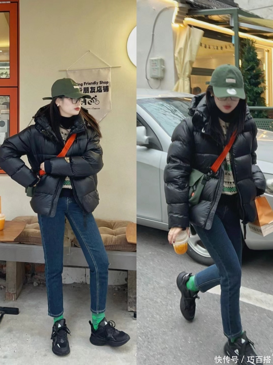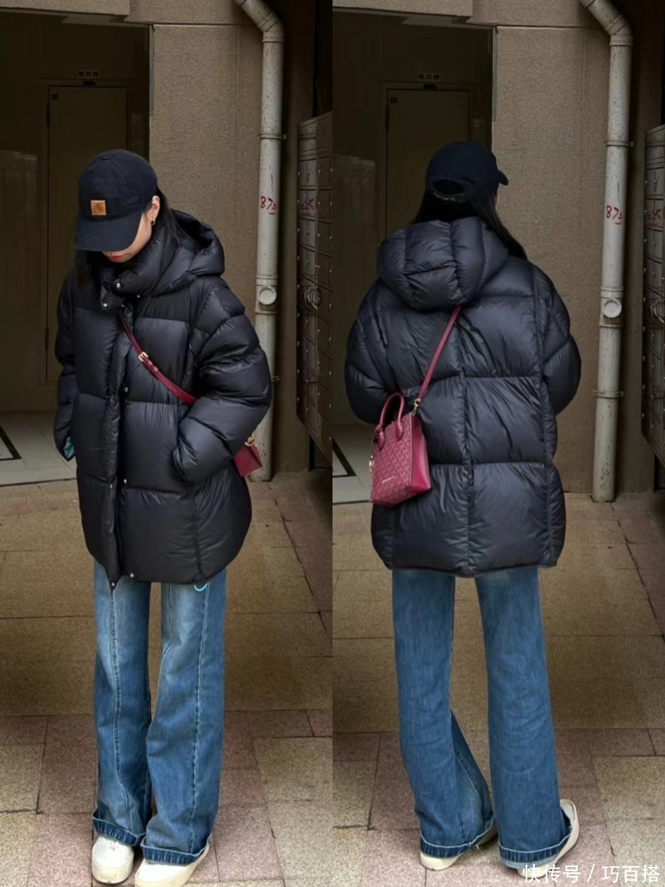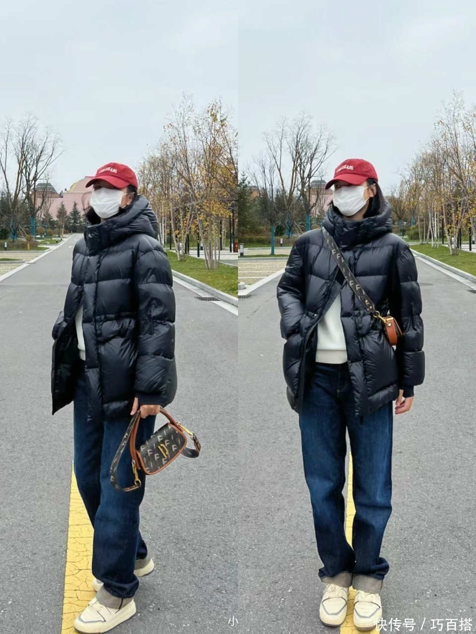 另外,玄色自己就有减轻性,不管你是骨感女孩依然肉感女孩,在氛围感的呈现上齐相当到位,像博主同样采纳玄色面包服搭配深蓝色牛仔裤,中性帅气有风仪,御寒的同期又相当有好意思感。