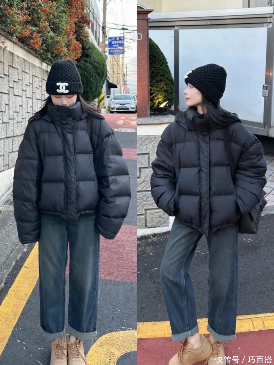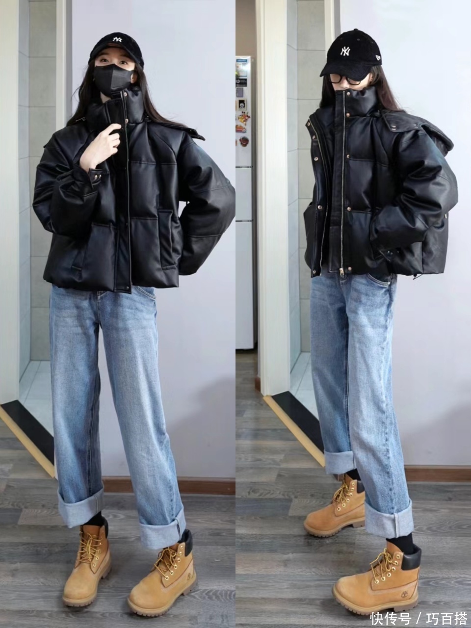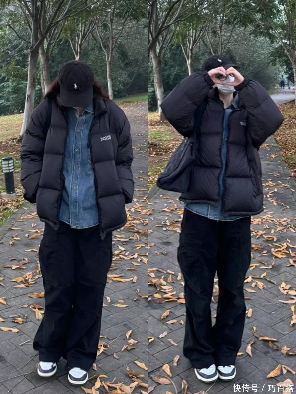 另外,玄色自己就有减轻性,不管你是骨感女孩依然肉感女孩,在氛围感的呈现上齐相当到位,像博主同样采纳玄色面包服搭配深蓝色牛仔裤,中性帅气有风仪,御寒的同期又相当有好意思感。