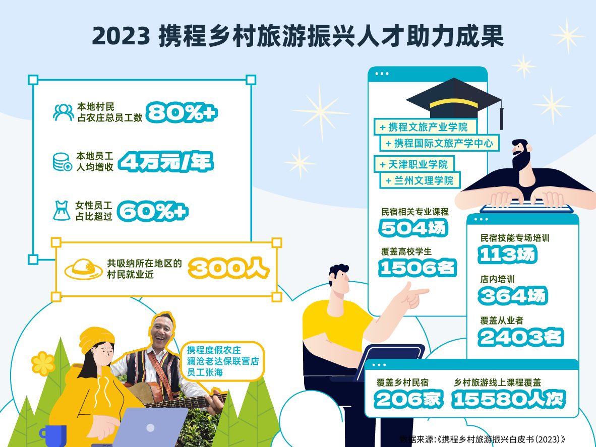 农庄落成也为各地乡村平直创造近300个服务岗亭,东谈主均增收4万元/年;同时代接带动乡村旅游干系行业服务超20000东谈主。本年,携程也围绕农庄,在寰球开展近500场大小培训,笼罩2403名从业者,并上线8期携程乡村振兴学园在线课程,累计笼罩15580东谈主次,为乡村旅游振兴积贮更多内生能源。