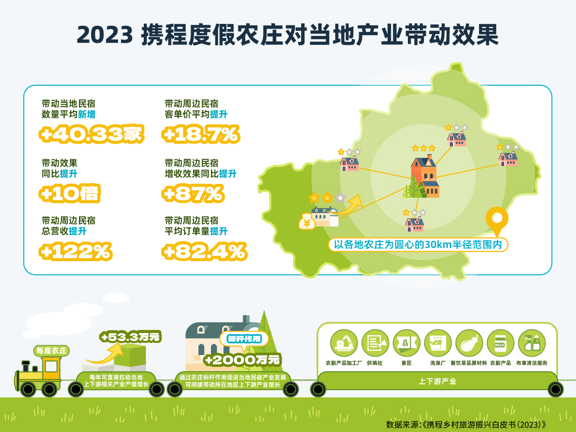 数据袒露,2023年1月-10月,以各地农庄为圆心30km半径边界内,每家农庄平均带动当地新增民宿40.33家,带动邻近民宿平均订单量升迁82.4%,带动邻近民宿客单价平均升迁18.7%,农庄的民宿标杆作用效果显豁。而民宿行业闹热,也带动了高卑鄙干系产业的振奋。把柄测算,平均每家携程农庄落成,每年可平直拉动当地高卑鄙干系产业产值增长约53.3万元。而通过促进当地民宿数目新增和产业发展,农庄迤逦带动场地地区高卑鄙产业增长约2000万元。